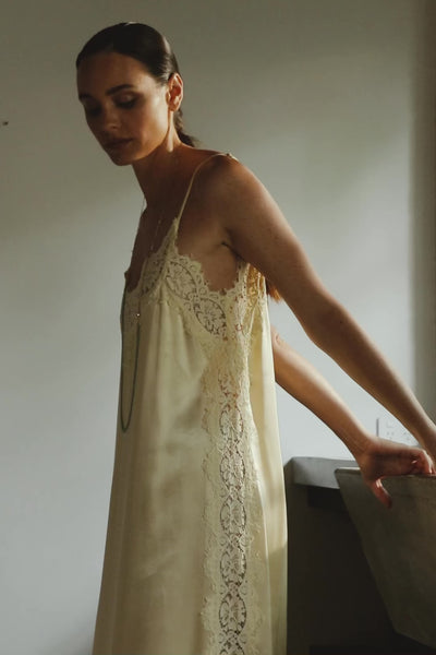 The Lenny Slip Dress in vanilla falls to a liquid-like drape, its viscose-rayon satin moving effortlessly with the female form. Delicate eyelash lace along the v-neckline, hem and side-seam adds subtle feminine allure, making this piece a timeless silhouette designed for quiet moments and romantic dinners alike.